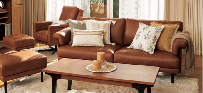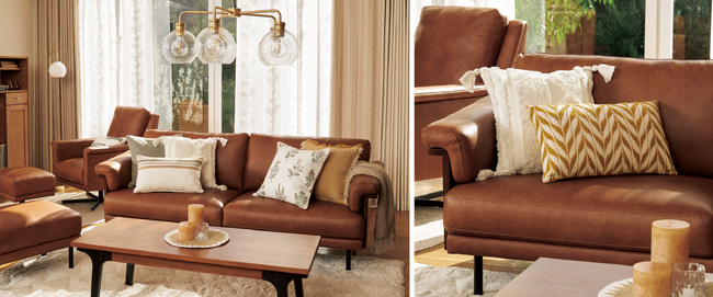 なめらかな肌ざわりで、触れるたびに癒される総革ソファ。時とともに変化する味わいを楽しみながらくつろぎのひとときを。