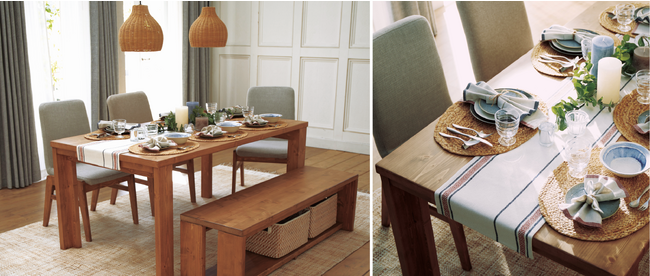 「Living in Comfort」の特長は何と言っても、一つひとつのアイテムの素材。オークやパインといった天然木や本革、ラタンやコットン・リネンなどの自然素材は、風合い豊かで上質な雰囲気があり、経年変化を楽しみながら長く使えると好評です。