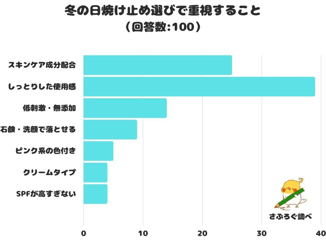 冬の日焼け止め選びで重視することをアンケートにて調査したところ、1位は「しっとりした使用感」 でした。