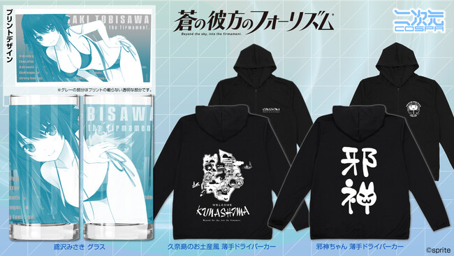 「鳶沢みさき」のデザイングラス、吸水速乾性と紫外線防止のW効果を備えた「邪神ちゃん」「久奈島のお土産風」薄手ドライパーカーが二次元コスパから登場。