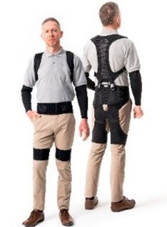 それらを体の動きに合わせて適切な位置に配置し、なおかつ動作によるずれを防ぐために、当社のサポーター開発で蓄積したノウハウをふんだんに盛り込んだ、アシストスーツです。