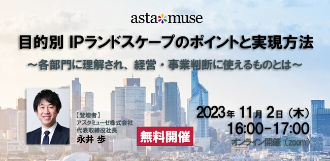 アスタミューゼ株式会社(本社:東京都千代田区、代表取締役社長 永井歩)は、2023年11月2日(木)16:00-17:00に、事業会社の知財担当者、R&D部門の方々を対象とした無料ウェビナー「目的別IPランドスケープのポイントと実現方法 ~各部門に理解され、経営・事業判断に使えるものとは~」を開催いたします。ご好評につき過去複数回実施した同タイトルのウェビナーの再開催となります。