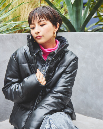 マットな質感が大人っぽいフェイクレザーのダウンは、デニムワンピやごつめブーツを合わせてカジュアルに。