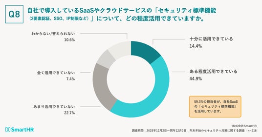 「自社で導入しているSaaSやクラウドサービスの「セキュリティ標準機能(2要素認証、SSO、IP制限など)」について、どの程度活用できていますか。」と質問したところ、「十分に活用できている」が14.4%、「ある程度活用できている」が44.9%という回答。59.3%が自社SaaSの「セキュリティ標準機能」を活用していることが分かりました。