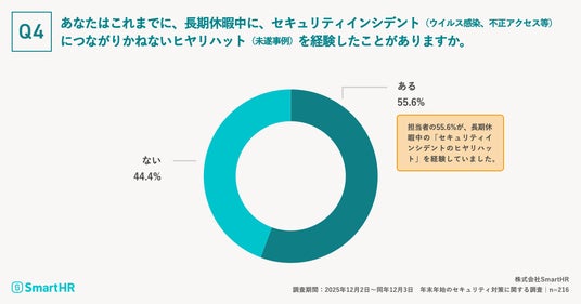 「あなたはこれまでに、長期休暇中に、セキュリティインシデント(ウイルス感染、不正アクセス等)につながりかねないヒヤリハット(未遂事例)を経験したことがありますか」と質問したところ、半数を超える55.6%が「ある」と回答しました 。