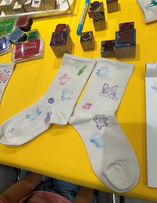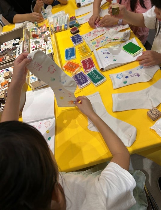 当社は、小学校低学年のお子さま向けに「靴下デザイナー」のお仕事体験を実施しました。無地の靴下に、福助オリジナルデザインの布用スタンプやペンを用いて自由にデザインし、さらに、当社直営店で使用している布製のギフト袋に入れてギフトラッピングを体験、ご自身がデザインした靴下を大切な人にプレゼントできるという内容で、6名のお子さまに参加いただきました。このお仕事体験を通し、将来を考えるきっかけづくりになればと思っております。