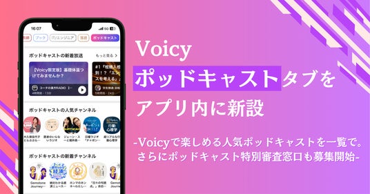 音声プラットフォーム Voicyは、リスナーとパーソナリティ双方のニーズに応え、7月2日(水)より「ポッドキャスト」タブをアプリ内に新設いたしました。このタブには、ポッドキャストの人気番組や新着のエピソードが集まります。本タブの新設により、Voicy内でも人気のポッドキャストをスムーズに検索・再生できるようになります。