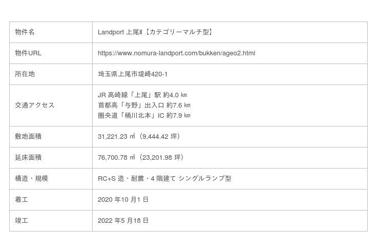 野村不動産株式会社(本社:東京都新宿区/代表取締役社長:松尾 大作、以下当社)は、当社が手掛ける高機能型物流施設「Landport(ランドポート)」シリーズにおいてLandport上尾IIが5月18日に竣工満床稼働したことをお知らせいたします。