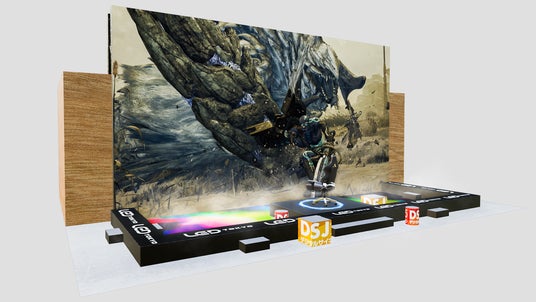 LED TOKYOの出展ブースでは、横幅10メートル・縦5.5メートル、4K解像度の450インチ大型LEDスクリーンを展示しており、モンハンシリーズ最新作『モンスターハンター ワイルズ』をその大型スクリーンで実際にプレイすることが可能です。