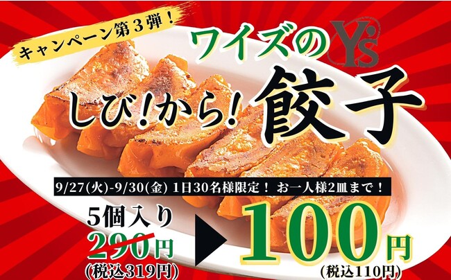 ・しび!から!餃子(5個入り)をお一人様2皿まで税抜100円(税込110円)にてご提供いたします。