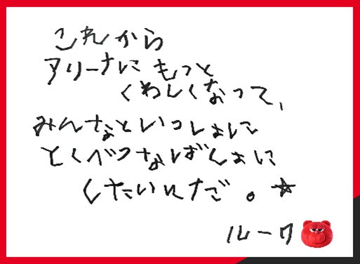 「これからアリーナにもっとくわしくなって、みんなといっしょにとくべつなばしょにしたいんだ。☆」
