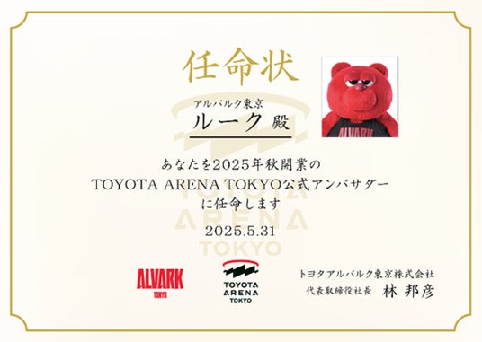 トヨタアルバルク東京株式会社(本社:東京都文京区、代表取締役社長:林 邦彦)は、Bリーグ「アルバルク東京」の公式マスコット「ルーク」を、2025年秋開業予定の新アリーナ「TOYOTA ARENA TOKYO」の公式アンバサダーに任命したことを発表します。