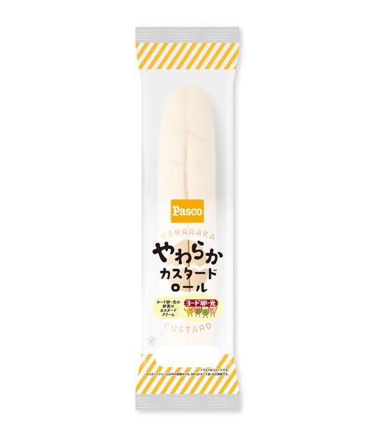 今回発売する「やわらかカスタードロール」は、ふんわりやわらかい白焼きのパン生地に、日本農産工業株式会社の「ヨード卵・光」の卵黄入りのカスタードクリームをはさみました。(カスタードクリーム中の卵黄のうち、96%がヨード卵・光の卵黄です。)