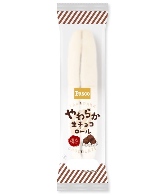 やわらか生チョコロールふんわりやわらかい白焼きのパン生地で、なめらかな生チョコ入りクリームをはさみました。