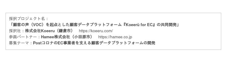eiicon company(所在地:東京都港区南青山、代表:中村 亜由子)は、神奈川県と運営する「BAK NEW NORMAL PROJECT 2022 大企業提示テーマ型(以下、本プログラム)」にて、Hamee株式会社(ハミィ、本社所在地:小田原市、以下 Hamee)により採択された、株式会社Koeeru(コエル、本社所在地:鎌倉市、以下Koeeru)との実証事業『ECと卸売両面から「顧客の声を可視化する」小売事業者向けプラットフォーム』の実証を開始することをお知らせいたします。