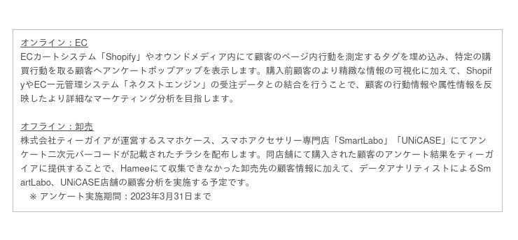 今回の実証では、オンラインとオフラインの両方でVOCを収集し、プラットフォームへの蓄積、分析、可視化を目指します。モバイルアクセサリーを販売するHameeのECサイトに実装するほか、Hamee社商品の取扱店舗様(卸売事業者)にご協力をいただき、オンラインとオフラインの両面で独自の検証を行っていきます。
