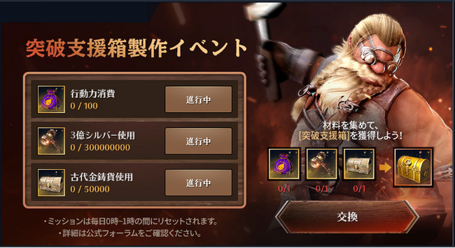 イベント期間中、ミッションをクリアすると、当イベントページより「支援品セット」「製錬されたハンマー」「丈夫な箱」を獲得できます。獲得したアイテムは、当イベントページにて「交換」ボタンをタップすると「突破支援箱」と交換することができます。