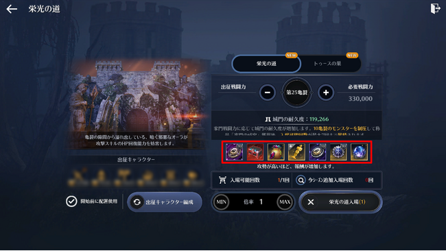 「栄光の道」の、「亀裂」難易度を調整しました。 シーズンキャラクターを追加後、家門戦闘力も以前よりも高くなったため、序盤の亀裂難易度を削除し、後半に高難易度の亀裂を追加しました。それと同時に「栄光の道」の報酬に「空虚の記章」を追加しました。「星座」など、他のコンテンツでも家門内のキャラクターを活用するため、家門戦闘力を上昇させる新たな目標として空虚等級の記章を追加しました。また、これまでの「栄光の道」は、全ての攻勢を防いだ時に報酬倍率が適用されていましたが、今回のリニューアルで倍率が適用される方式を除去し、従来の報酬の約2倍に相当する報酬を必ず獲得できるように改善しました。