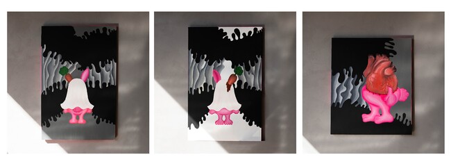 人間誰もが持っているであろう、「不気味な存在に向けた好奇心や恐怖心」をテーマに制作活動をおこなうアーティスト、”unspooky” (アンスプーキー)。彼女の描く、白いシーツを被ったキャラクターたちは、そうしたテーマから創造されたモチーフであり、絵画に留まらずデジタル、アニメーション、とさまざまな手法で表現されています。今回の展示テーマは、「When you gaze long into an abyss the abyss also gazes into you(落ちそうになっている自身の深淵とどう向き合っていけばいいかわからない不安定な感情)」。本展では、オイルとアクリルを混在させて描いたキャラクターたちの「迷走シリーズ」として、10点のキャンバス作品と60cmの立体フィギュアが会場に登場します。