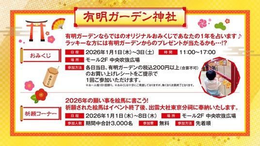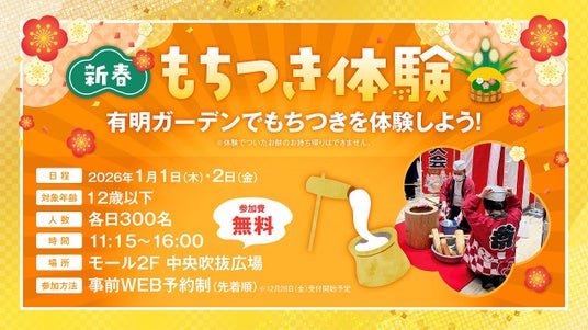 期間中は、有明ガーデンの恒例企画「新春300本引き」をはじめ、日本の伝統行事を体験できる「もちつき体験」、館内に登場する「有明ガーデン神社」、さらに新春福袋フェアや冬のバーゲンセールなど、ご家族皆さまでお楽しみいただける多彩な企画をご用意しております。