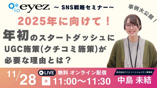 クチコミマーケティングのプラットフォーム「トラミー」を運営する株式会社アイズ(所在地:東京都渋谷区、代表取締役社長:福島範幸、東証グロース:5242)は、11月28日(木)に無料のオンラインセミナー「【12月から始める!】年初のスタートダッシュにUGC施策(クチコミ施策)が必要な理由とは!?」を開催します。