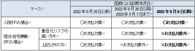 当社では、新型コロナウイルス感染症に罹患された場合には、実際に医療機関等に入院された場合に加え、入院が必要にもかかわらず、医療機関の事情により、宿泊施設や自宅等で療養し、医師の治療を受けている場合(以下、「みなし入院」)は、医療機関から保健所に提出される発生届の対象となる重症化リスクの高いケースにおいて、保険約款に定める入院に準じるものとして特別に入院給付金等のお支払いの対象としております。今般の位置づけの変更により、2023年5月8日以降に新型コロナウイルス感染症と診断された場合、「みなし入院」については、一律入院給付金のお支払い対象外となります。