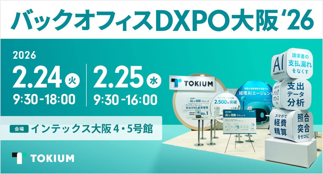 経理AIエージェントを提供する株式会社TOKIUM(本社:東京都中央区、代表取締役:黒崎 賢一、以下「TOKIUM」)は、2026年2月24日から2月25日までの2日間、インテックス大阪で開催される「バックオフィスDXPO大阪」に出展いたします。