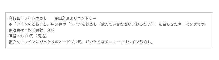 「ワインのめし」は、JR東日本社員のみなさまからの「ワイン県、山梨らしいローカル色豊かな車窓の景色を見ながら駅弁を」というご提案をそのまま駅弁として作らせていただきました。名誉ある賞をいただき本当にありがとうございました。