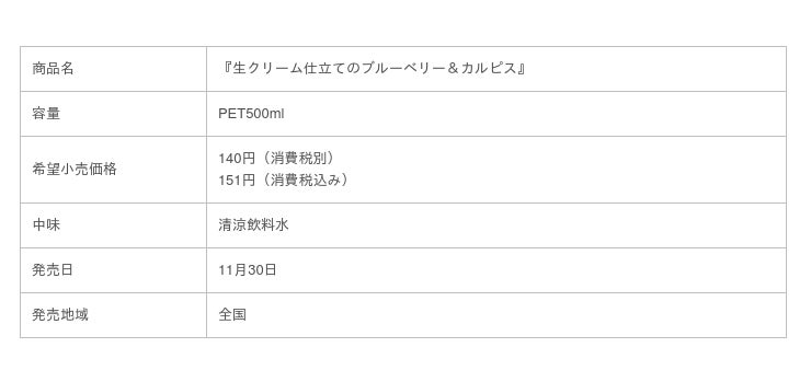 アサヒ飲料株式会社(本社 東京、社長 米女 太一)は、『生クリーム仕立てのブルーベリー&カルピス』PET500mlを11月30日より期間限定で全国発売します。