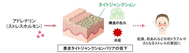 忙しい現代人にとって心理的ストレスやそれが一因となって引き起こされる肌トラブルは、日常的に感じる悩みのひとつです。これまでにストレスによって肌バリアの機能や回復力が低下することが報告されており、肌バリアの乱れは乾燥や肌あれ、痒みなどの症状を引き起こすことから、さらなるストレスの引き金にもなりかねません。そこでこの負のループを断ち切るため、ストレスにより分泌されるホルモンであるアドレナリンと肌バリアにとって重要なタイトジャンクションの関係に着目して、ストレスが肌バリア能を低下させるメカニズムの解明に取り組みました。