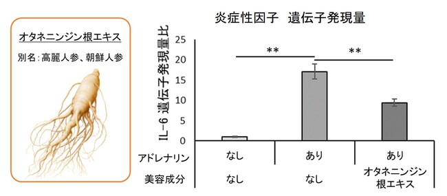 オタネニンジン根エキスは古くから疲労回復などに有効な生薬として用いられ、根には多くの有用成分が豊富に含まれています。そこで、このエキスのアドレナリンによって起きる炎症に対する効果を検証するため、同エキスとアドレナリンを加えた表皮細胞の炎症性因子IL-6の遺伝子発現量を解析しました。その結果、オタネニンジン根エキスを添加した表皮細胞では未添加の細胞よりもIL-6の発現量が低下しており、同エキスはアドレナリンによる炎症を抑制する効果をもつことが見出されました(図5)。