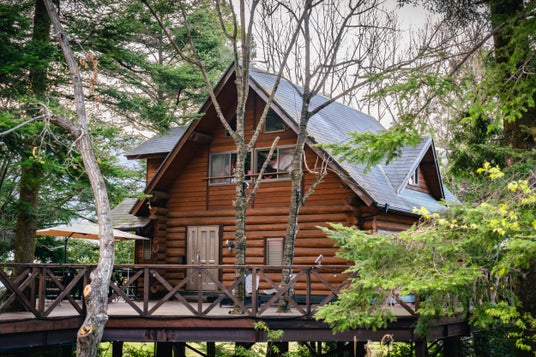 木々の緑に赤いテントの屋根が映えるウッドデザインパーク与位は、兵庫県第2の面積を誇り、さらに
