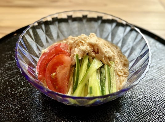 しっかりコシのあるそうめんに、鶏ほぐしと夏野菜を、さっぱりゴマダレで仕上げました。