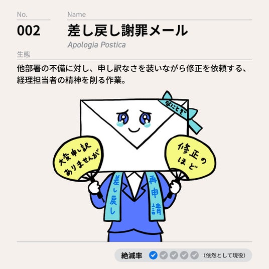 - 生態:他部署の不備に対し、申し訳なさを装いながら修正を依頼する、経理担当者の精神を削る作業。