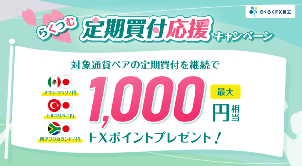 対象期間中の『らくらくFX積立』において、4月~6月の3ヵ月間、月額2万円以上の定期買付を行っていただいたお客様に1,000FXポイントをプレゼントいたします。