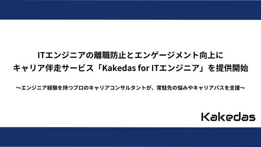企業向けの教育研修事業と若年層向けの就職支援事業を展開する株式会社ジェイックの子会社である、国内最大級のキャリア面談プラットフォーム「Kakedas(カケダス)」を運営する株式会社Kakedasは、ITエンジニアを対象としたキャリア伴走サービス「Kakedas for ITエンジニア」の提供を開始しました。本サービスを通じて、常駐エンジニア特有の孤立感や不満を解消し、エンジニアのパフォーマンス向上や離職防止、エンゲージメント強化といったIT企業の課題解決に貢献します。