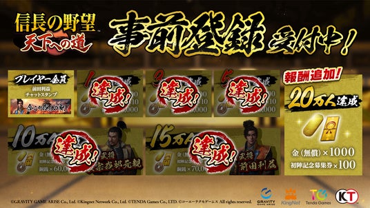 グラビティゲームアライズ株式会社(所在地:東京都中央区)は、スマートフォン向け新作ゲームアプリ『信長の野望 天下への道』の事前登録者数が15万人を突破したことをお知らせいたします。また、事前登録キャンペーン報酬の追加を決定いたしました。