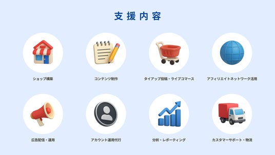 出店支援・運用代行・動画制作・アフィリエイトネットワーク活用・ライブコマースをワンストップで実現