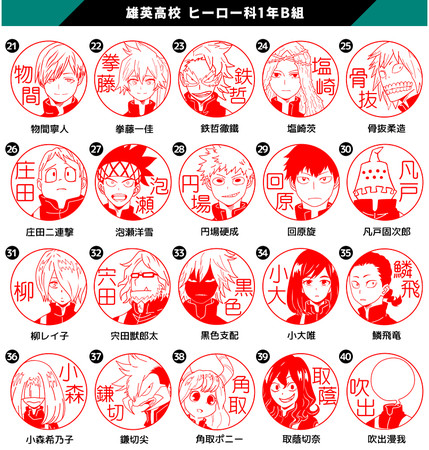 選べるキャラクターのイラストはこちらの47種類。ヒーローになることを夢見る主人公の緑谷出久(通称:デク)やデクの幼馴染みの爆豪勝己(ばくごうかつき)・麗日お茶子(うららかおちゃこ)・轟焦凍(とどろきしょうと)など雄英高校のヒーロー科・1年A組の生徒たちや、物間寧人(ものまねいと)・拳藤一佳(けんどういつか)・鉄哲徹鐵(てつてつてつてつ)といった1年B組の生徒たちに加え、雄英高校の教師でプロヒーローであるオールマイトや相澤消太(あいざわしょうた)といったヒロアカ好きにはたまらないキャラクターがせいぞろい。