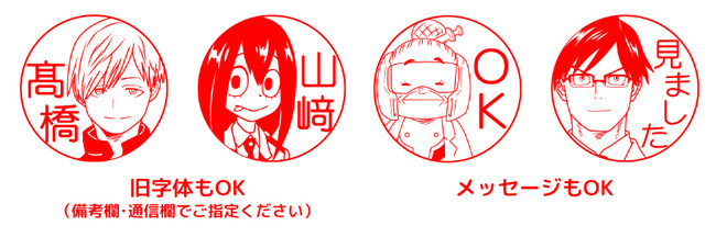 苗字や名前はもちろん、旧字体、ペンネームやハンドルネームのほか、「OK」「見ました」「ありがとう」といったメッセージを入れることも(漢字3文字・ひらがなカタカナ5文字・アルファベット6文字まで。イラスト見本のようなキャラ名のままでの制作もOKです)。