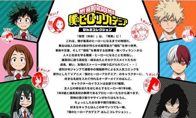 インターネットのはんこ屋さん「印鑑はんこSHOPハンコズ」を運営する株式会社岡田商会(所在地:大阪府大阪市、店長:岡山耕二郎)は6月22日より自社オンラインショップにて、人気アニメ「僕のヒーローアカデミア」のキャラクター入りはんこ「僕のヒーローアカデミア はんこコレクション」の予約受付を開始いたしました。