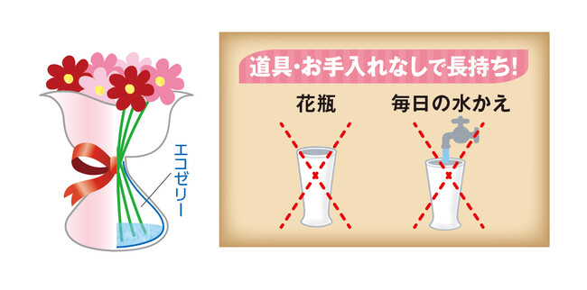 お花の栄養剤や抗菌剤を含んだお水をゼリー状に固めた吸水剤がカップ内に入っています。道具や毎日の水替えなしで鮮度を保てるためお手入れがラクちんです。