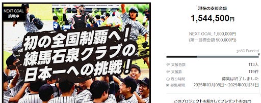 チーム・団体やアスリートを支援するスポーツ専門クラウドファンディングを展開するスポチュニティ株式会社(東京都中央区、以下スポチュニティ)は、練馬石泉クラブ(東京都練馬区)のクラウドファンディングを実施し、支援金額1,544,500円(目標達成率308%)を達成して終了しました。今回得た支援金は、参加選手・監督・コーチの岡山での全国大会参加費用の往復交通費・宿泊費に活用されました。
