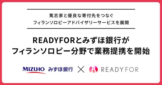 READYFOR株式会社(所在地:東京都千代田区、代表:米良はるか、以下「当社」)は、株式会社みずほ銀行(取締役頭取:加藤勝彦、以下「みずほ銀行」)と社会貢献・寄付活動に関心のある富裕層のフィランソロピーニーズに対応するため、フィランソロピーアドバイザリーサービスに関する業務提携契約を締結しました。