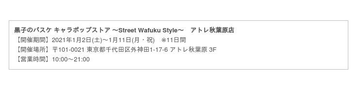 「黒子のバスケ キャラポップストア」は、物販・ミニゲームなどの遊び・展示を通してアニメ「黒子のバスケ」の作品世界を存分に体験していただく期間限定のイベントショップです。2020年6月に和服スタイルの描き下ろしイラストを使用した「~Street Wafuku Style~」が登場。試合でのユニフォーム姿とは一味違った彼らの姿や、表情が楽しめます。