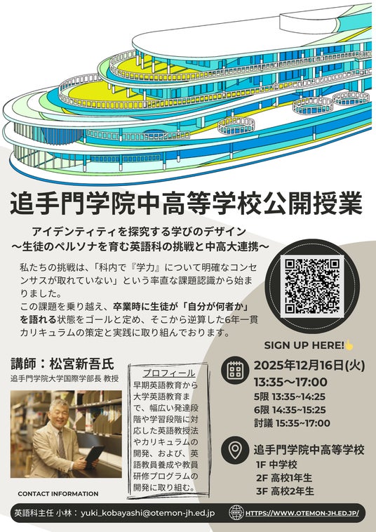 探究的な学びを基盤に、未来社会を築く力と主体的に行動する力を育む追手門学院中・高等学校(大阪府茨木市、校長:木内 淳詞)は、12月16日(火)に教育関係者を対象とした英語科公開授業を開催します。