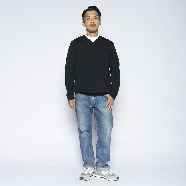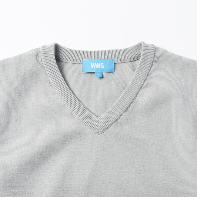 シャツやネクタイに合わせやすいVネック。袖口や裾はリブ仕様でスッキリとしたデザインに。
