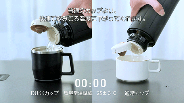 DUKK魔法瓶のフタに飲み物を注ぐと、その瞬間から熱の吸収を開始! 沸かしたアツアツのお湯もわずか90秒ぐらいで60℃程度まで降下します。