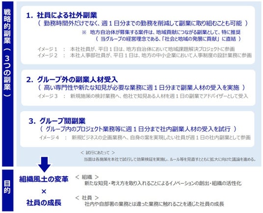 「戦略的副業」では、各社の本社において、1.社員による社外副業、2.グループ外の副業人材受入、3.グループ間副業、の3つの副業を同時に試行開始しています。それぞれの副業の対象は、プロジェクト的に課題解決に取り組む業務です。本試行により当該業務に各々のキャリア(職業上の経験、ビジネススキル等)を活かすとともに、今後のキャリア形成につなげてまいります。