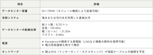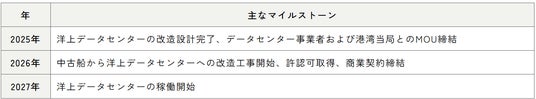 - 都市圏周辺での大規模な土地の確保および土地の取得費用が不要建設期間の短縮洋上データセンターの改造工事は1年程度で、従来の陸上データセンター開発と比較して開発期間を最大3年短縮できる可能性があります。
